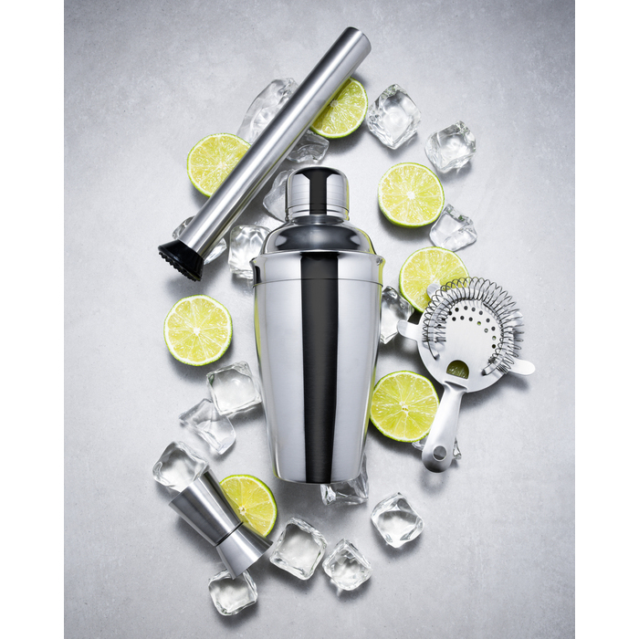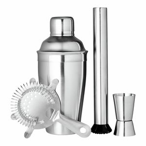 Barsett laget av rustfritt stål som inneholder alt du trenger for å blande gode cocktailer hjemme. Shaker, målebeger, cocktail-sil og muddler. Shakeren har en kapasitet på 550 ml.