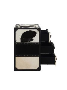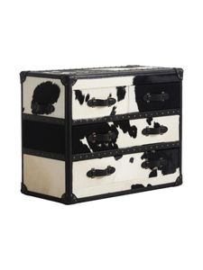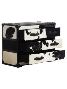 Denne kommoden er et ekte statement-møbel. Med en kombinasjon av sort-hvitt kuskinn, detaljert lærkant langs sidene, og en solid eikebase, utrstråler den luksus og karakter. De elegante naglene langs sidene og de stilige håndtakene gir kommoden et sofistikert preg. Hver kommode er unik, og ingen er helt like. Noe som gjør dette til et eksklusivt tilskudd til hjemmet ditt. En perfet balanse mellom håndverk, kvalitet og design