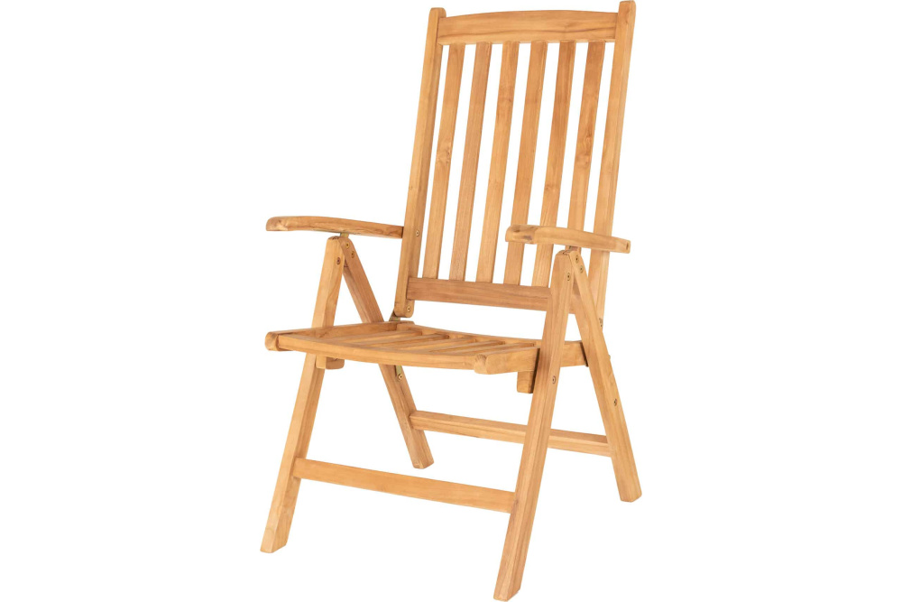 Sammenleggbar posisjonsstol i teak. Gjør seg godt som spisestol eller i et lite kafésett med to stoler og bord.
