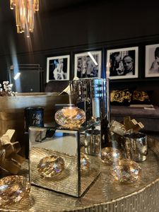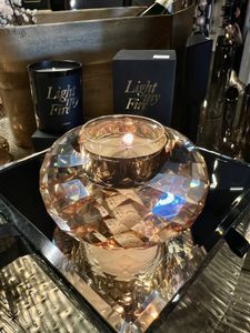 Telysholder i farget glass som gir et varmt lys og masse refleksjoner fra de slipte kantene.