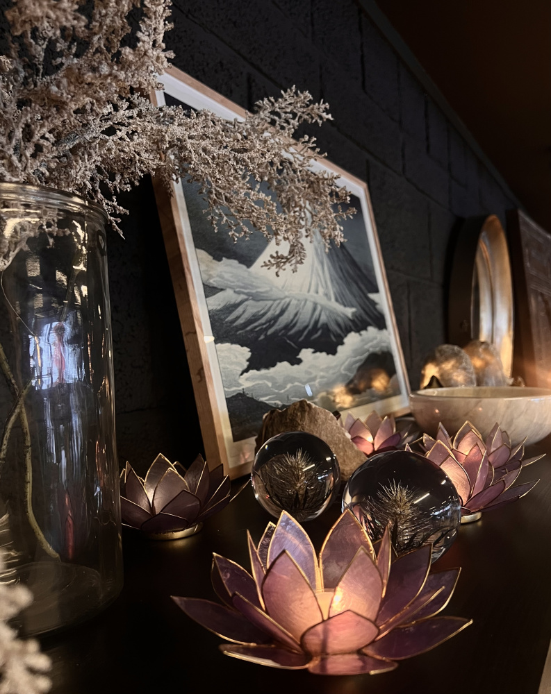 Skap ro og harmoni hjemme med denne elegante telysholderen laget av skjell, formet som en lotusblomst. Den fine, lilla fargen og de delikate kronbladene sprer et mykt lys som gir en fredelig og avslappende atmosfære.