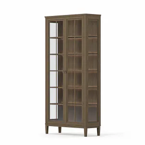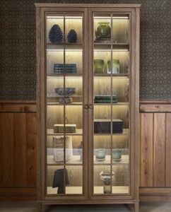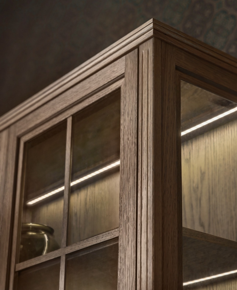 Dette er et vitrineskap i eik, beiset i den populære beisen «Burned Walnut». Det vakkert utformede vitrineskapet er en hyllest til tidløs design og er hovedsakelig laget av høykvalitets eik, noe som sikrer et solid og slitesterkt møbel. Med en subtil kombinasjon av klassisk håndverk og moderne elementer er skapet utstyrt med integrert LED-belysning som lyser opp interiøret ditt. Den brente valnøttfinishen gir skapet en naturlig og varm følelse, mens dette vitrineskapet er skapt for å tåle tidens trender og bli en pålitelig følgesvenn i hjemmet ditt.